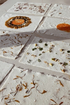 Confection de plusieurs feuilles de papier artisanales avec différentes expérimentations.